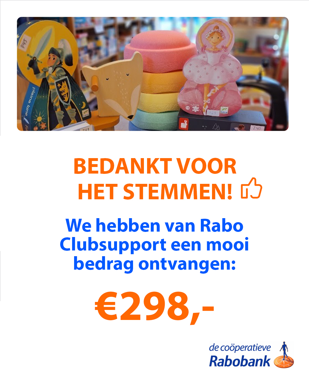 Bedankt voor het stemmen! oktober 22, 2025 | Geen reacties | algemeen Bedankt voor het stemmen! Dankzij jullie steun bij Rabo ClubSupport heeft de speelotheek het mooie bedrag van €298,- ontvangen! Daar kunnen we weer fantastisch nieuw… Lees meer